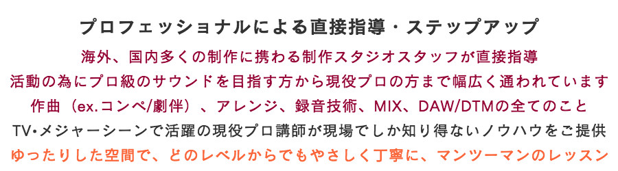 講師はメジャーアーティストのツアーや、レコーディング、プロデュース、有名タレントやモデル、NHK/民放人気番組、CM、大手企業の音楽を数多く手がける、第一線の現役プロ。